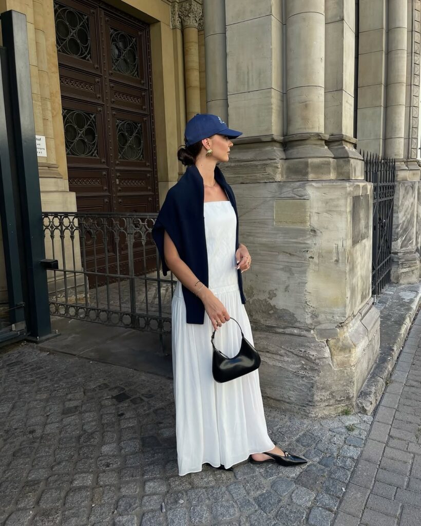 In this dress, you have to wear a white colored maxi dress and with it you have to wear this blue colored sweater which will make you cool. Along with this, you have to wear these black colored sandals which will make you cute and with this outfit, you have to carry this black sun bag in your hands.