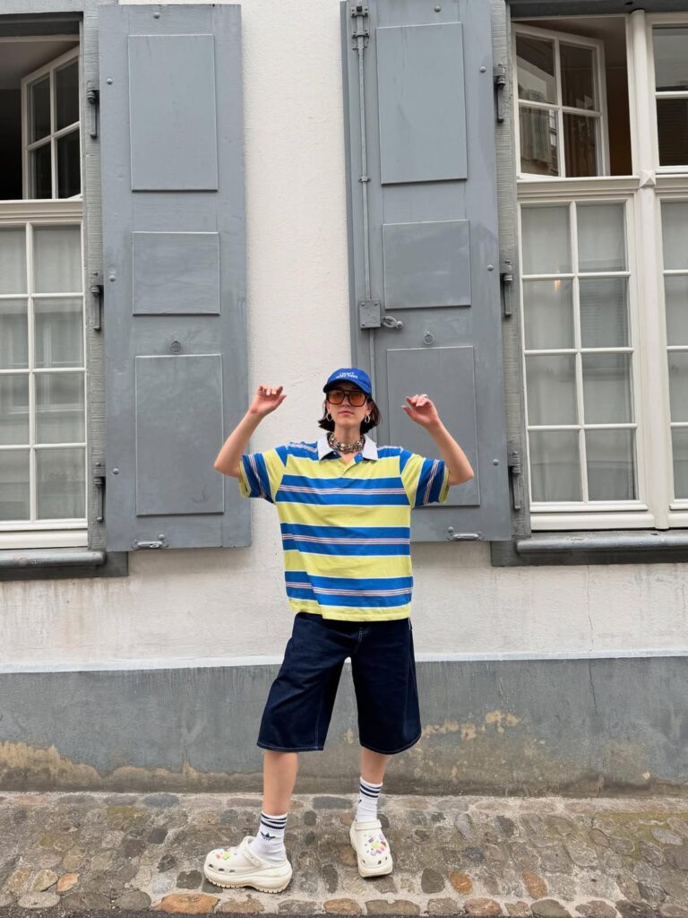 1. Blue Cap Style With a Graphic Tee and Denim Shorts