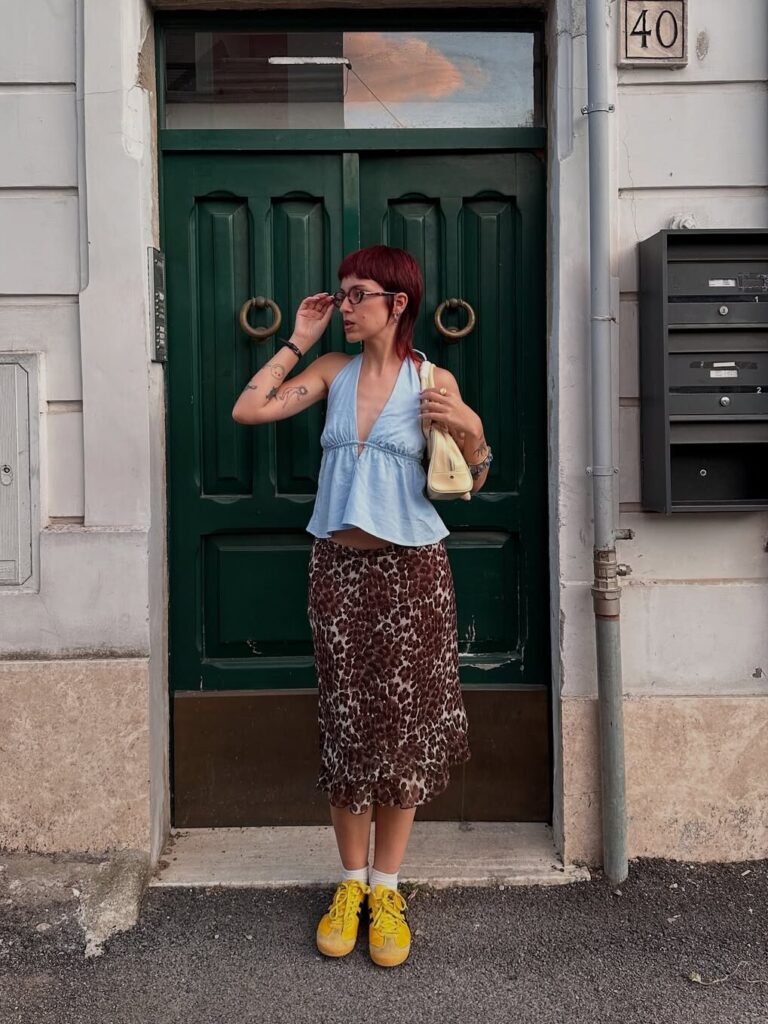 In this Blue Halter Top combination, you have to take a light blue color top which looks very beautiful, along with this you have to wear a leopard skin printed maxi skirt which looks very beautiful, along with this you have to wear yellow color sneakers, with which she is wearing white color socks and this is also a cream color bag.