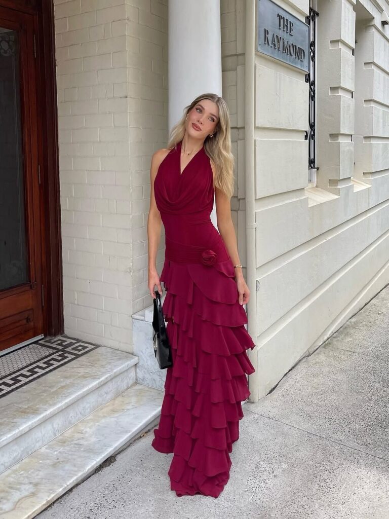 In this Red Maxi Dress combination, you will get to see a flower-like design whose color will also be available in rose color. Along with this, it is wrapped around your neck and it has been designed with some flower layers. Along with this, you have to keep this black colored handbag. This is going to make you look smart.