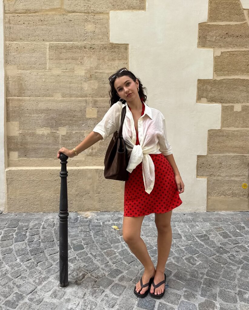 Now we are going to do something magical on this red dress, yes we are going to pair this red with black dotted dress with a white colour shirt, with this you have to wear black colour slippers which gives a very summery feel, first you have to see the design of this shirt and then you can try this dress.
